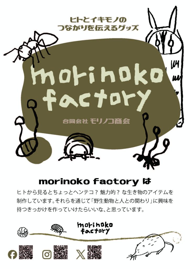 こんにちは。morinoko factory(モリノコ・ファクトリー)です。ちょっとヘンテコ?魅力的?な生き物の絵柄やデザインのアイテムを作っています。ワタシたちは今まで冊子やポスターの企画編集やデザイン、イラストなどを通じて、 身近な野生動物やその生育環境のことを、専門家の方々といっしょに伝える仕事をしてきました。さまざまな生き物のことを学び、考え、描き、伝える中で生まれた絵柄やデザインをグッズにしました。 どうぞ SNS などをのぞいてみてください。そしてこれらの品々が、もっと野生動物と人との関わりを考えていただくきっかけになればとてもうれしいです。