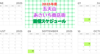 お知らせ 2025年度五天山あさいち商店街スケジュール 2025年度の五天山あさいち商店街を以下の日程で開催いたします!6/29(日)8:00~12:007/21(月・祝)8:00~12:008/31(日)8:00~12:009/28(日)8:00~12:0010/13(月・祝)8:00~12:00 2025.05.20 お知らせ